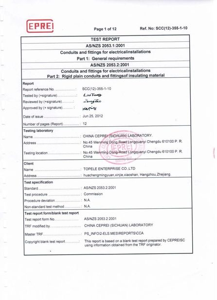 Standaard:TEST REPORT Aantal:SCC(12)-355-1-10 Uitgiftedatum:2012-06-25 Scope / Range:AS/NZS 2051.2:2001 Standard Uitgegeven door:CHINA CEPREI (SICHUAN) LABORATORY |