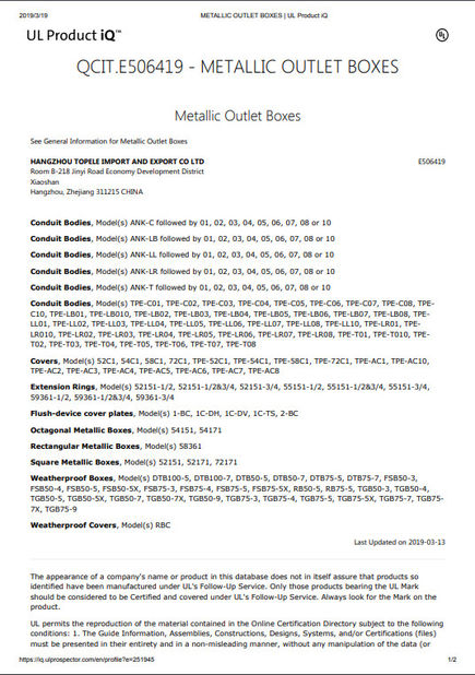 Standaard:UL CERTIFICATE Aantal:E506414 Scope / Range:STEEL ELECTRIC METALLIC TUBING, ELBOW AND BEND 45 90 Uitgegeven door:UL LLC |